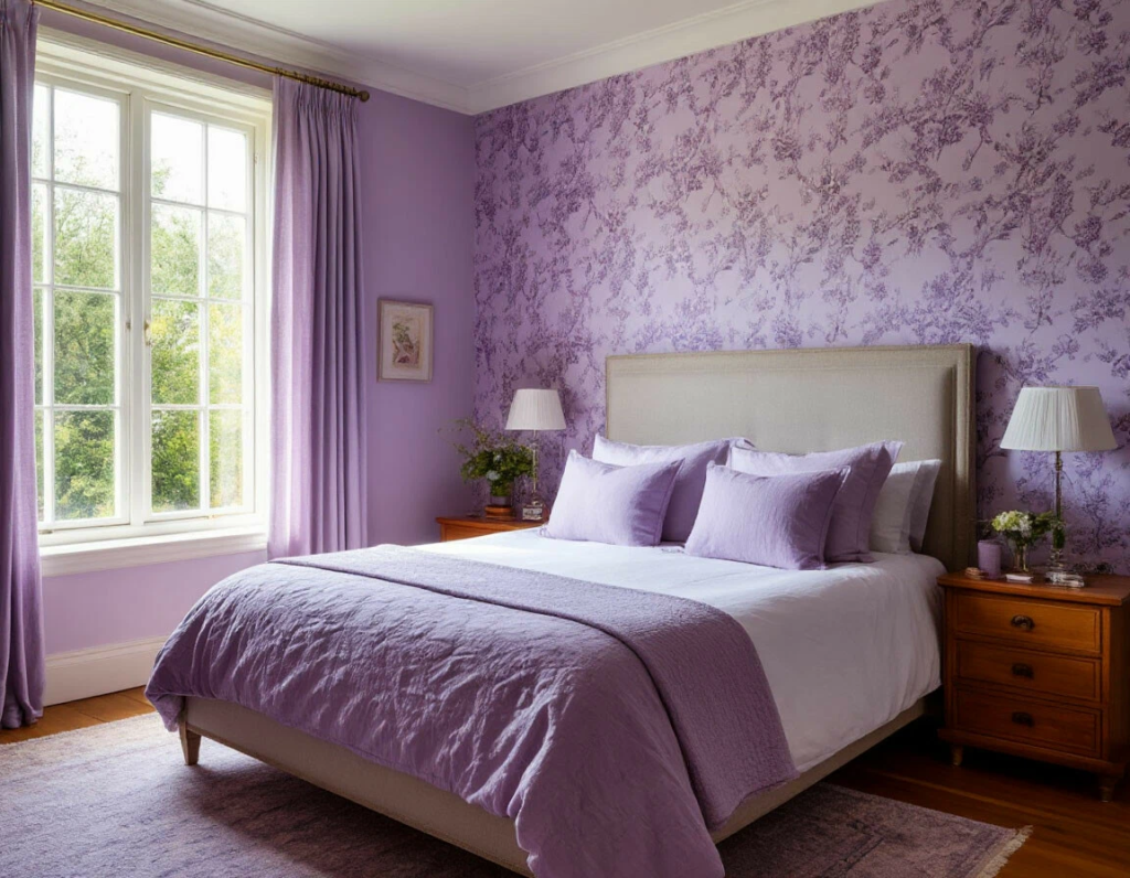 Лаванда, сиреневый, мягкий фиолетовый. Фиолетовый ассоциируется с медитацией и спокойствием, способствует внутреннему сосредоточению и умиротворению. Однако холодные фиолетовые тона могут создавать ощущение прохлады, поэтому важно сочетать их с тёплым текстилем или акцентами, чтобы спальня оставалась уютной. |