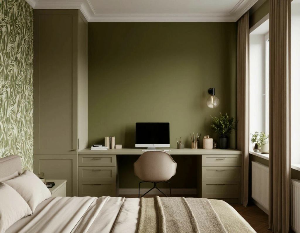 - Зонирование: спокойные однотонные оттенки в пространстве для сна, структурные или геометрические — на месте работы.
